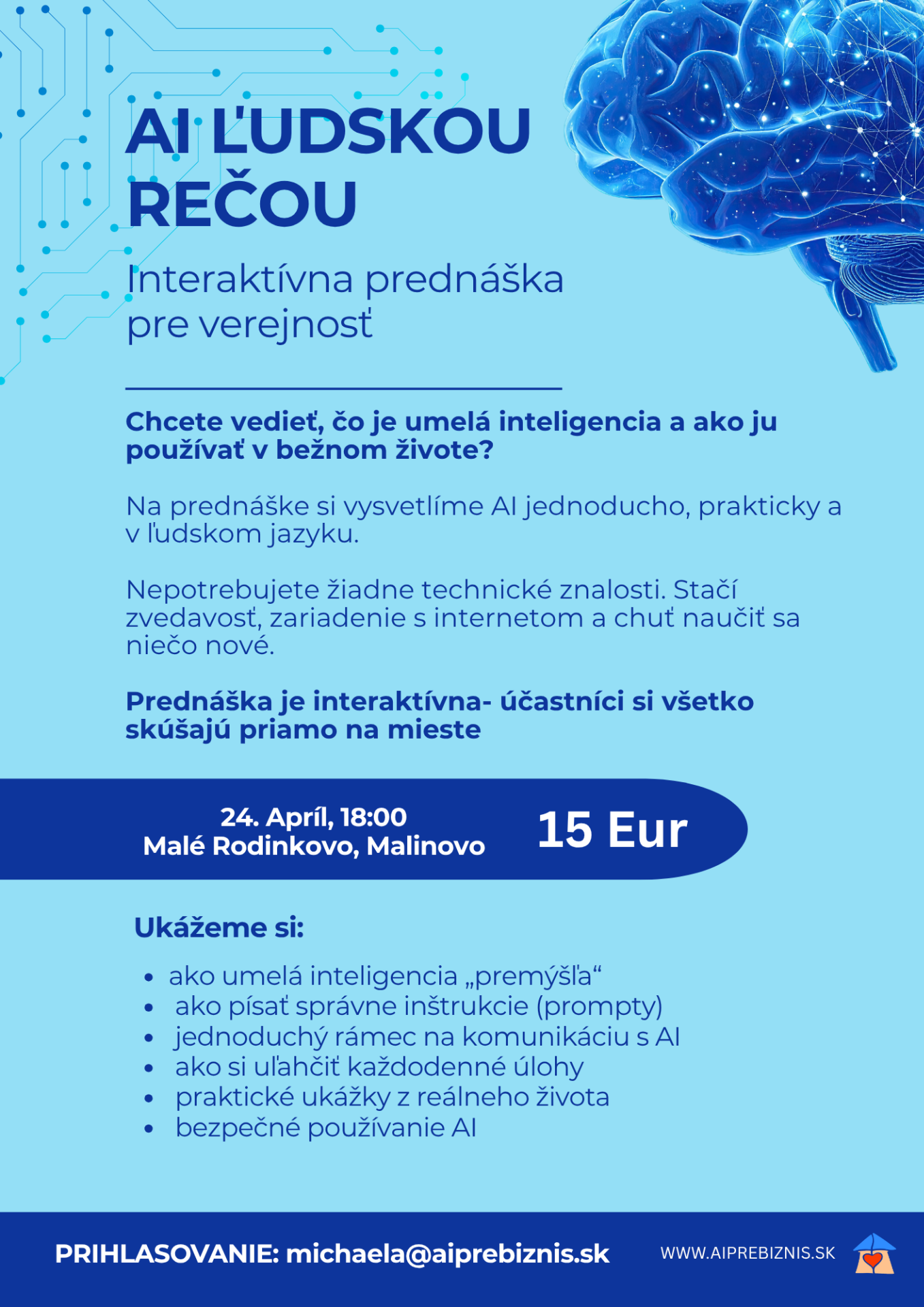 Chcete vedieť čo je umelá inteligencia a ako ju používať? Pozývame Vás na interaktívnu prednášku s Michaelou Carpenter z AI PRE BIZNIS. Nepotrebujete žiadne technické znalosti, stačí Vám zariadenie s internetom a chuť učiť sa.