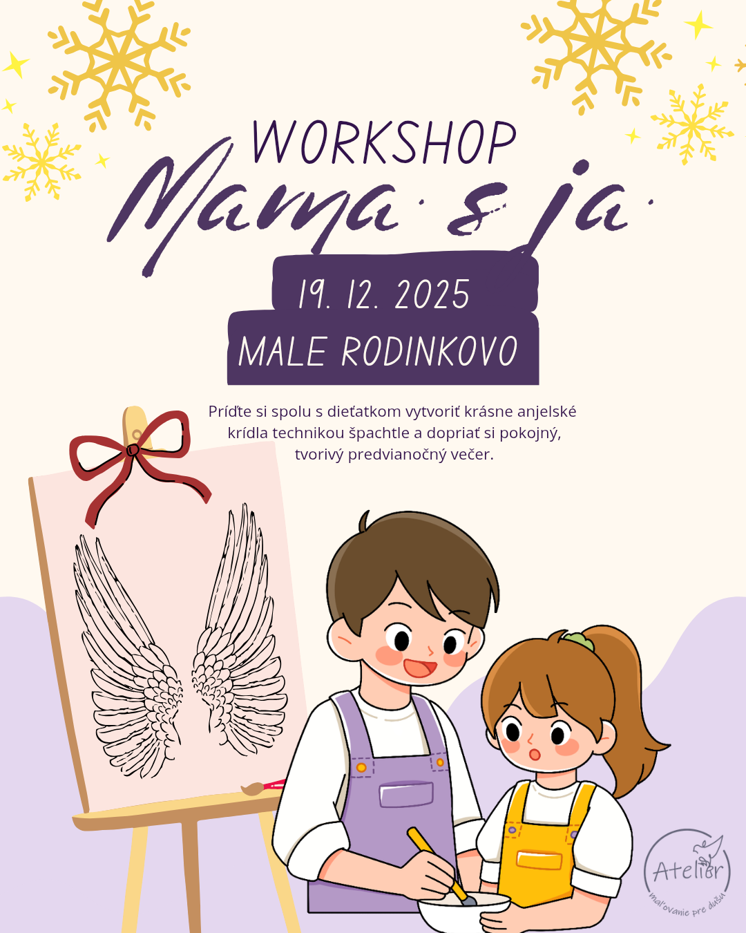 Srdečne vás pozývame na jedinečný večerný workshop pre mamičky a ich deti, kde spolu vytvoríte krásne anjelské krídla na plátne pomocou špachtle a štruktúrovacej pasty. V tomto pokojnom, predvianočnom večeri chceme ponúknuť priestor na spomalenie, tvorenie a jemné prepojenie. Workshop nie je len o maľovaní – je to príležitosť na kvalitný čas spolu, na oddych a prehĺbenie spoločného vzťahu mama a dieťa. Tešíme sa na vás a na spoločné krídla!
